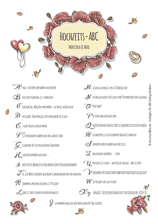 Mit einer Eheschließung bekennen sich die Brautleute öffentlich und unter Zeugen zu ihrer Beziehung. Wurde früher von den Brauteltern, die auch das Hochzeitsfest ausrichteten, zur Heirat der Tochter eingeladen, verschicken heute die Brautleute ihre Hochzeitseinladungen an Freunde und Verwandte selbst. Individuelle Hochzeitskarten unterstreichen dabei den persönlichen Stellenwert der Festlichkeiten. So wie unsere kostenlosen Hochzeitkarten zum Ausdrucken, die ihr alle online gestalten und bequem mit eurem PC-Drucker zu Hause ausdrucken könnt. Wählt einfach aus den unterschiedlichen Designs die Hochzeitseinladung, die euch am besten gefällt. Da das Layout bei allen Hochzeitsvorlagen vorgestaltet ist, braucht ihr nur noch den vorgeschlagenen Einladungstext personalisieren. Eure individuelle Hochzeitseinladung könnt ihr anschließend als PDF-Druckvorlage kostenlos herunterladen und beliebig oft ausdrucken.